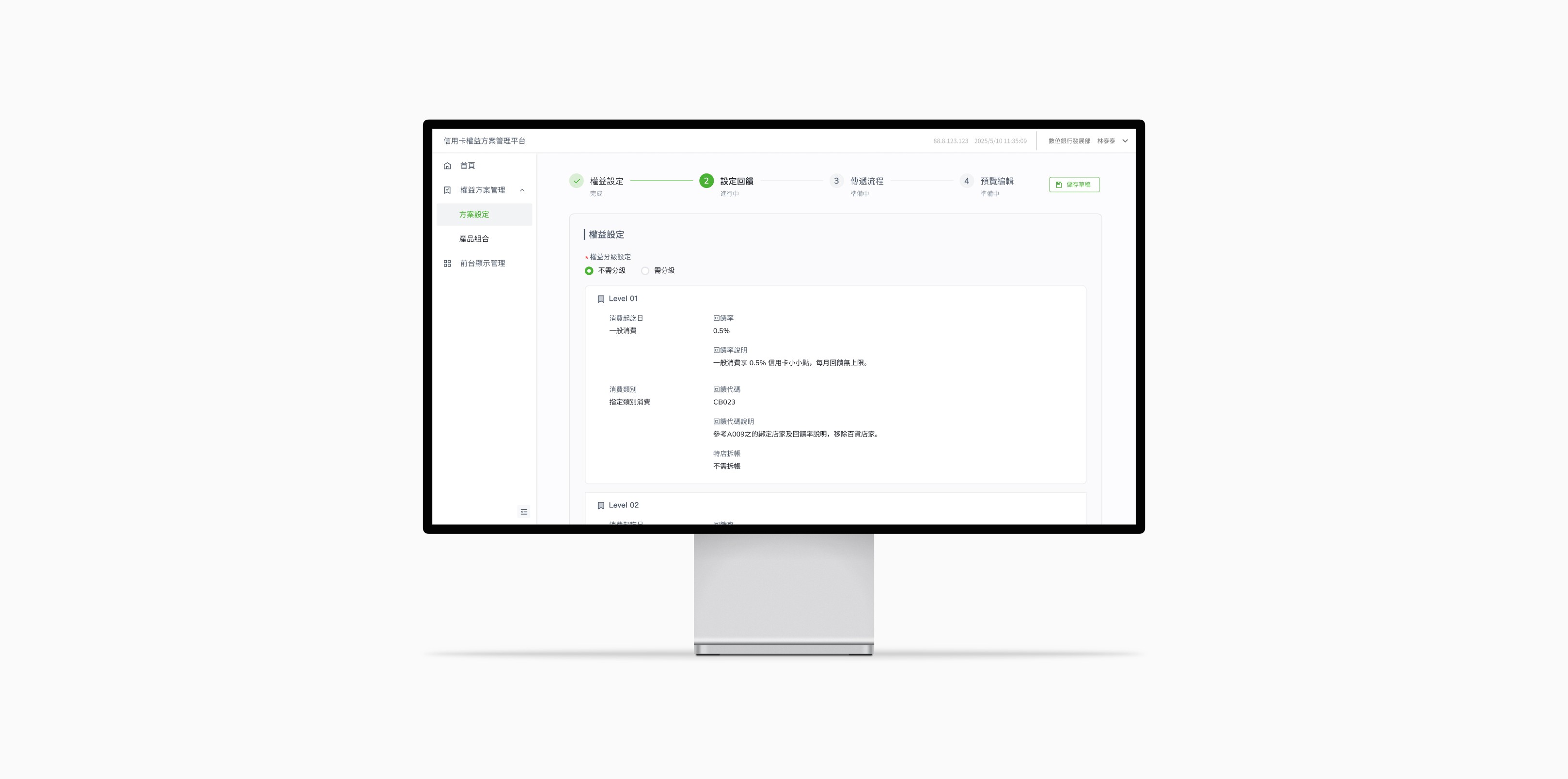 這是一個為數位信用卡打造的 B2B 營運後台。面對擁有 600 萬活躍用戶與千億交易規模的龐大生態,核心的動態回饋機制過去受限於人工維運的低效瓶頸。我主導了從 0 到 1 的系統轉型,包含設計及研究在內的流程,將權益的設定機制轉換為可擴充性模組化介面元件,成功將權益上線時間從 3 個月縮短為即時,並得到良好的使用體驗回饋。讓產品團隊自主、快速且精準的回應市場競爭,隨時掌握商業先機。