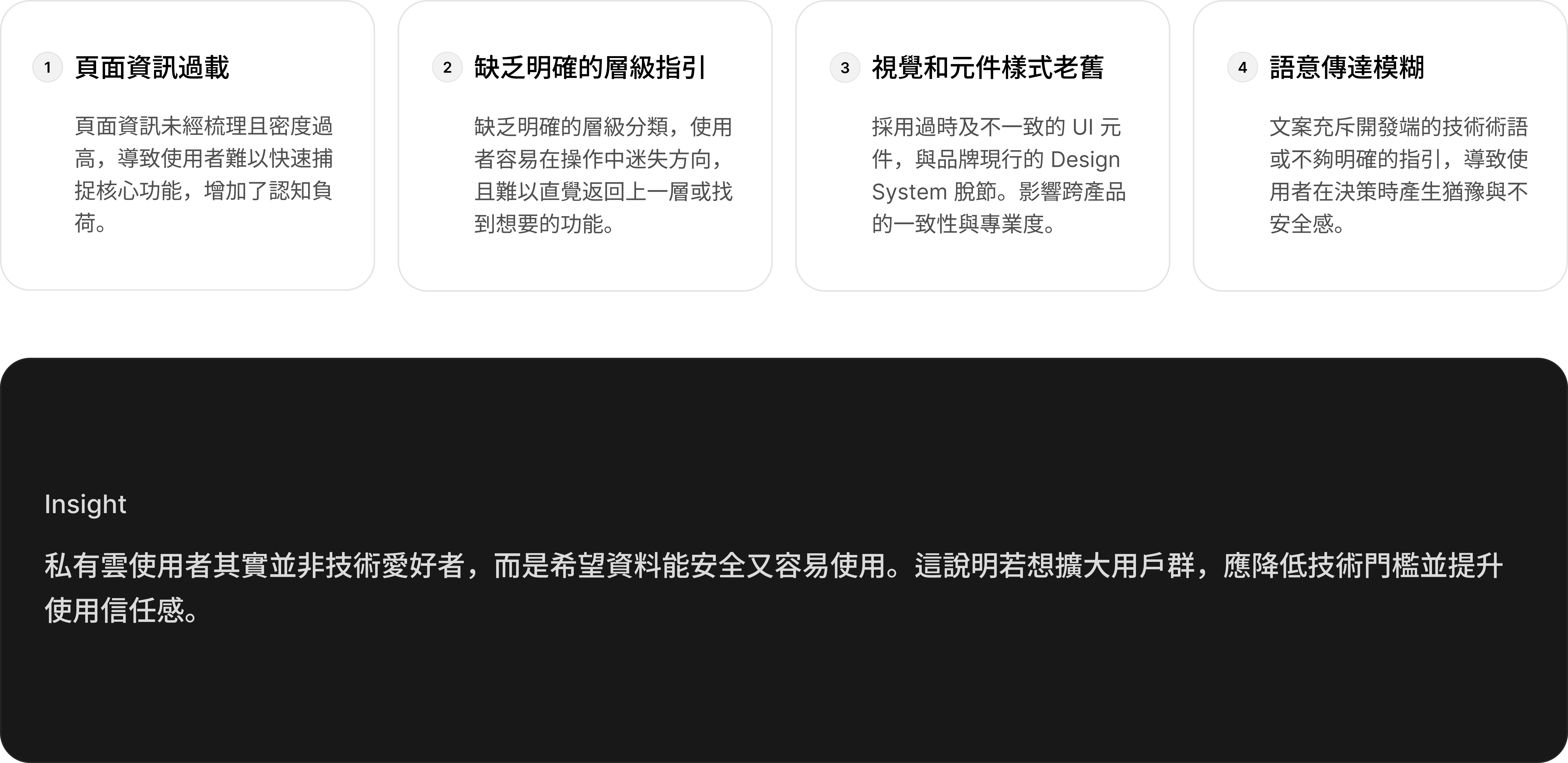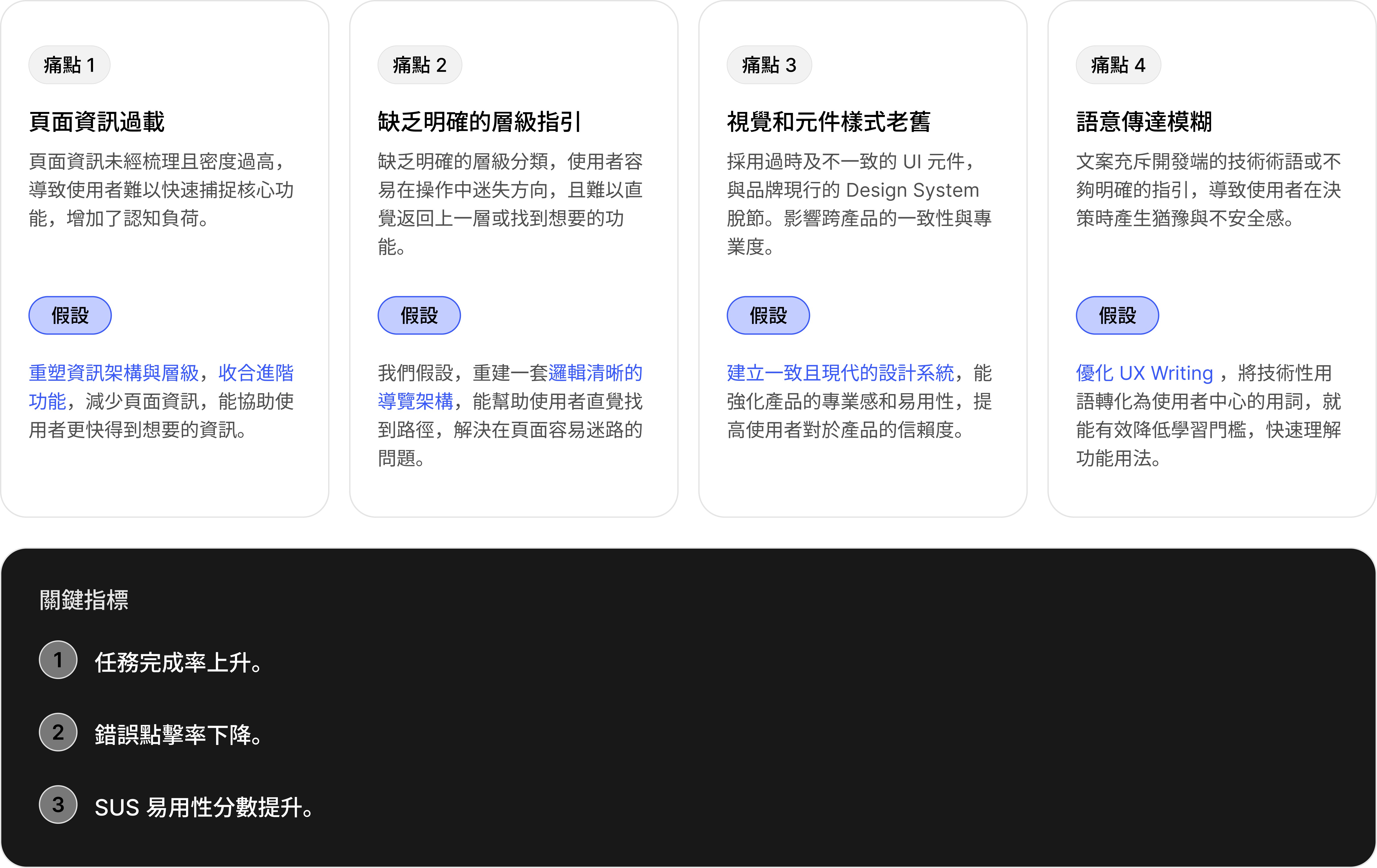 透過將痛點可視化,團隊成員得以共同看見用戶在操作中的情緒低谷與任務失敗點,只有當整個團隊對用戶的痛點達成共同的價值觀和願景時,我們才能從根本上打造出一致、可靠的產品。