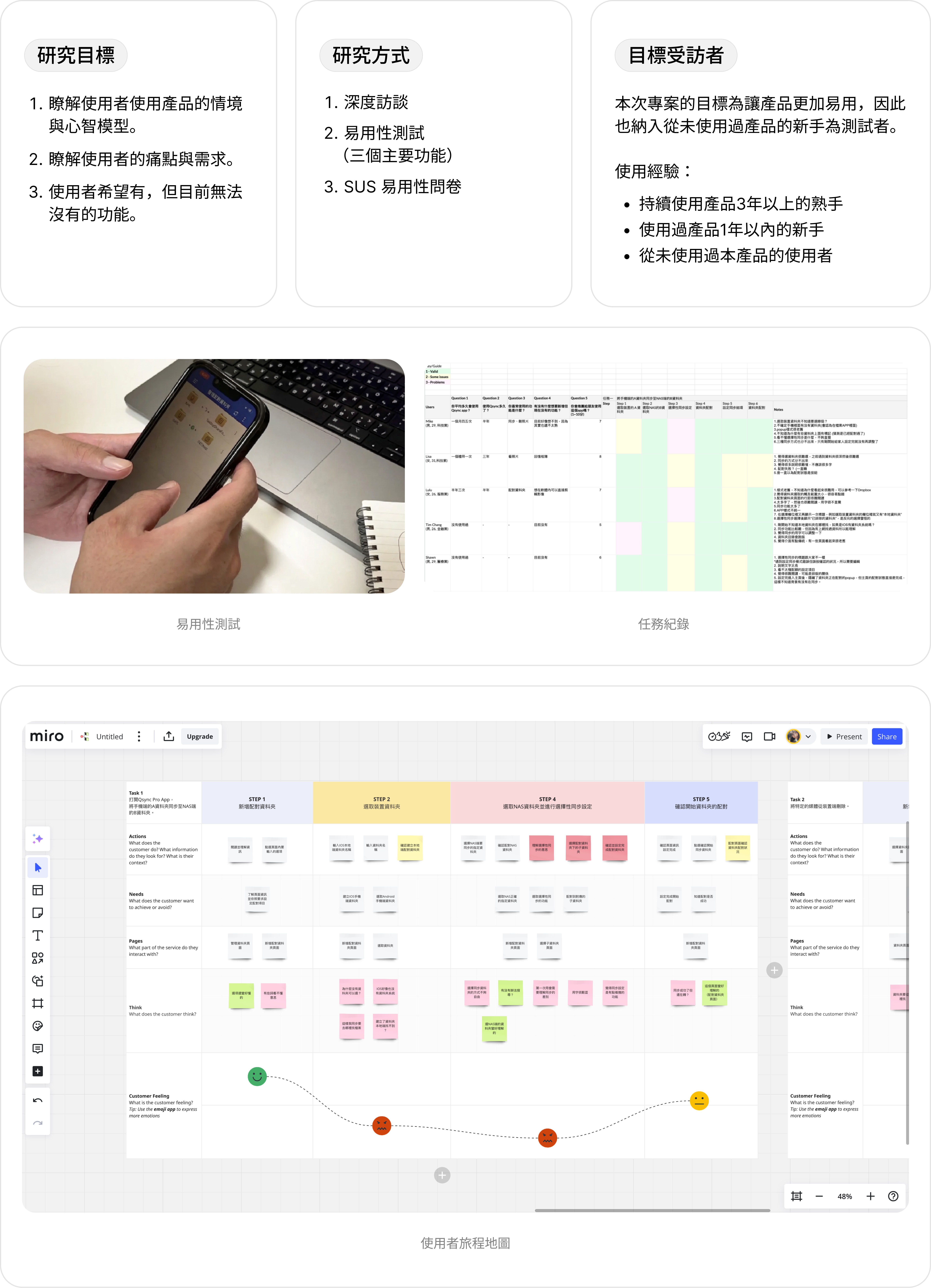 為了深入理解使用者的心理模型、期望與挫折,並透過 SUS 問卷收斂量化指標 ,讓我能以使用者視角重新審視介面,釐清現階段介面的可用性,以及哪些體驗需優先改善。