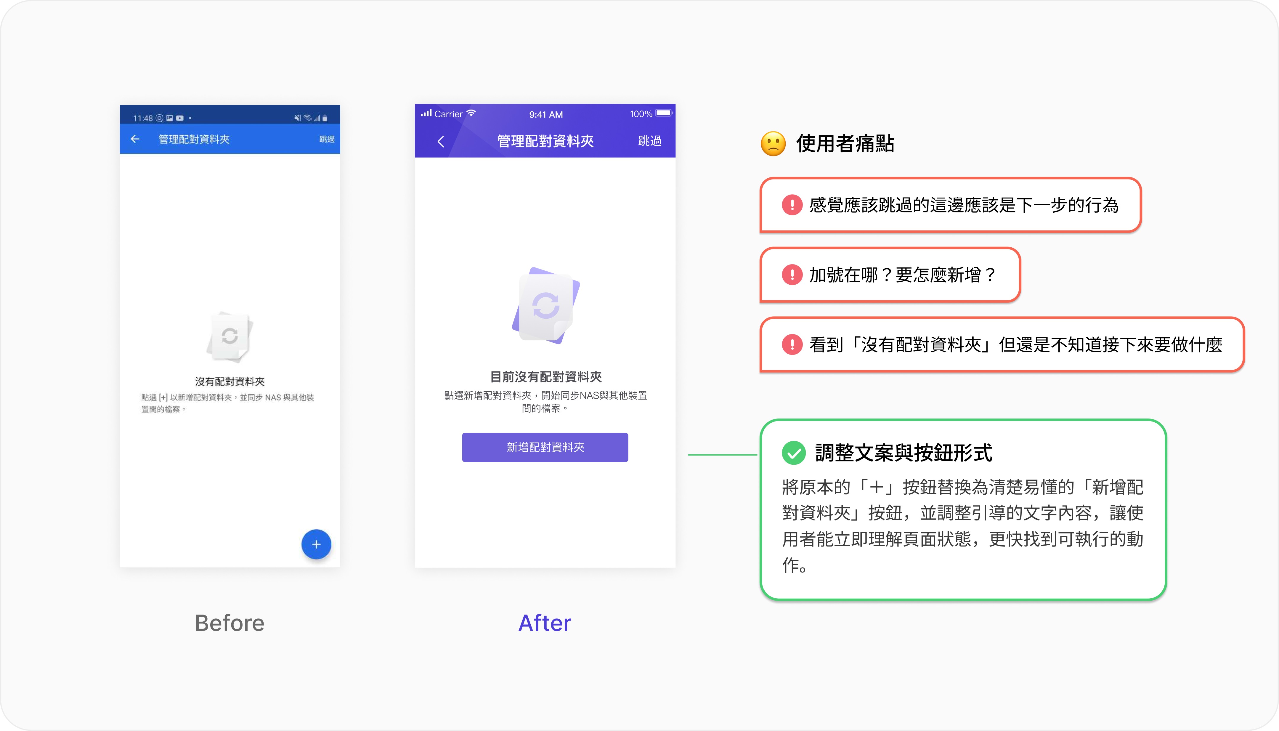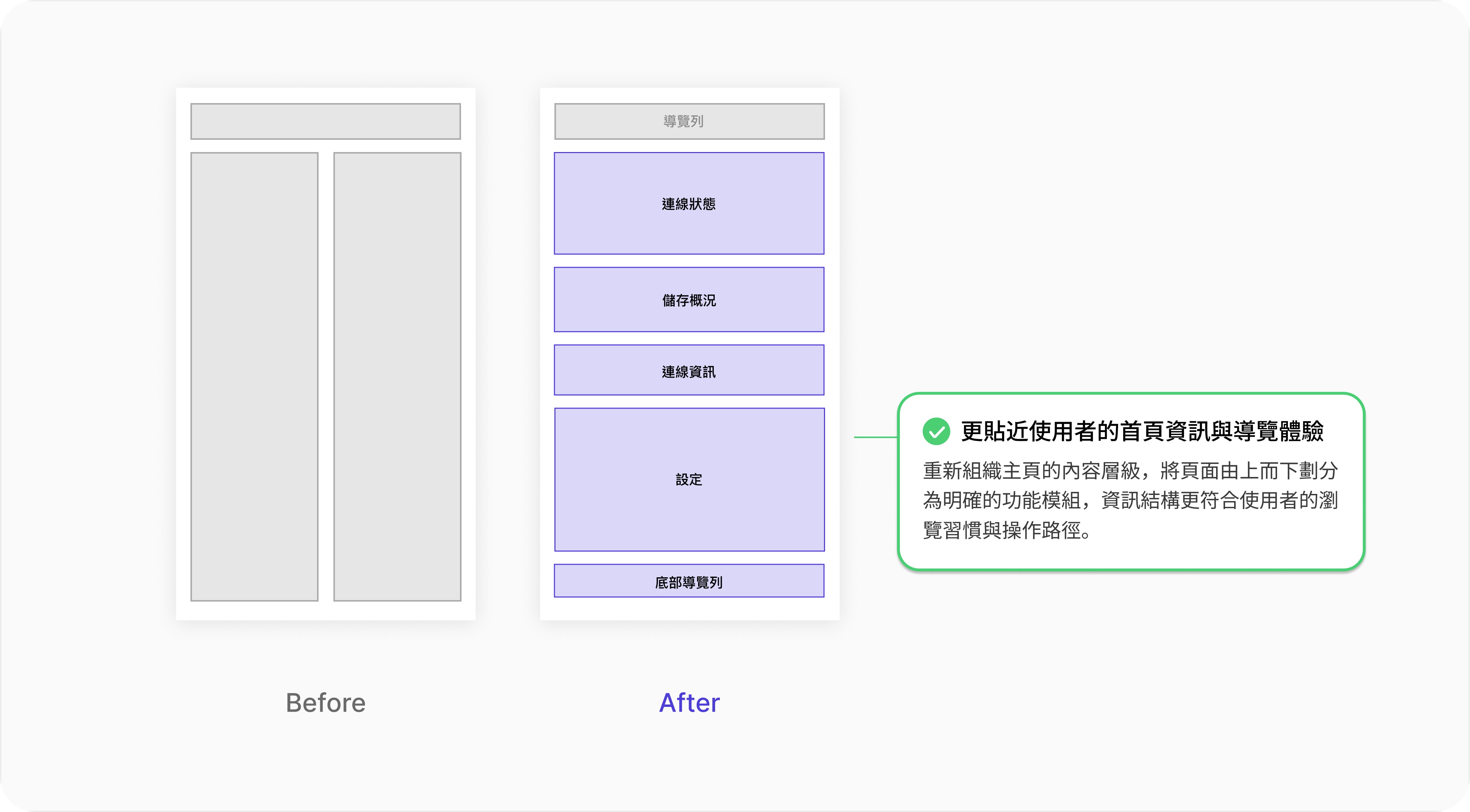 舊版首頁缺乏資訊層級,導致使用者無法快速掌握同步狀態與容量資訊,我重新設計了資訊排列方式,讓頁面由上而下依不同資訊內容模組化分區,並依據使用者研究結果,依據資訊重要性重新調整了顯示的內容,更貼近使用者的需求與使用習慣。