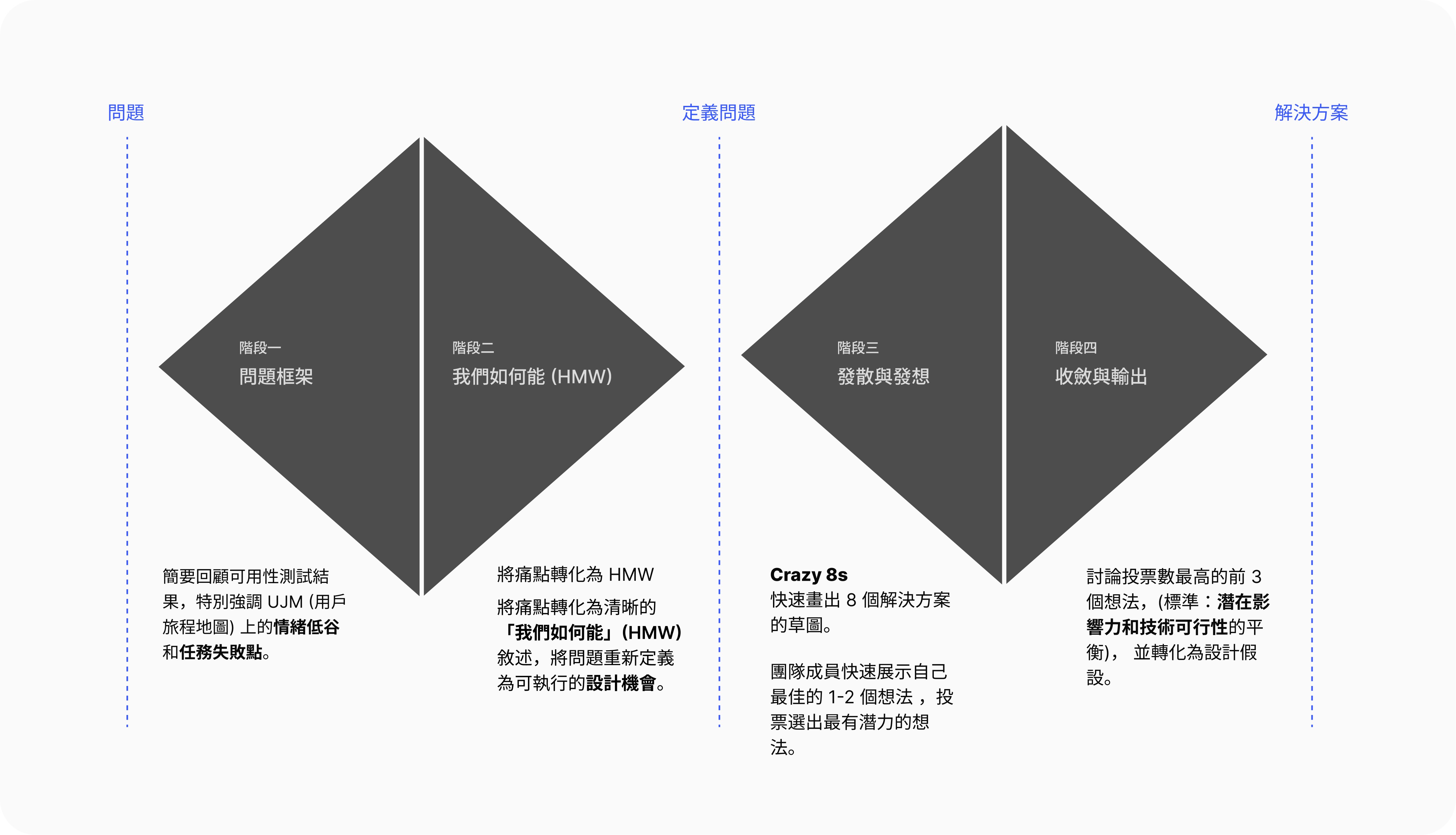 根據使用者洞察的結果,我籌辦了一場 How Might We 工作坊,把易用性測試中發現的問題,真正轉化成團隊都能執行的下一步行動。以下是工作坊的流程: